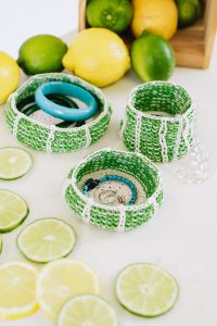 These trinket baskets are worked from the center of the base out. You can make the base and sides any size you choose. You can either cast-on in your normal preferred way or try Emily Ocker’s Circular Cast-On Method to avoid having a hole at the center of the base.