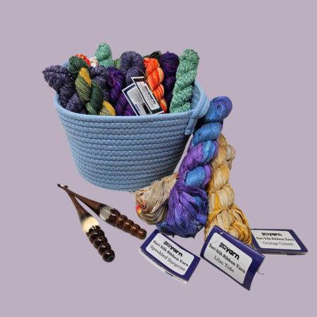 This box is like opening a rainbow. You’ll get a curated mix of our bestselling recycled silk yarns across weights and textures — spun by artisans using sari scraps and recycled silk threads. These yarns are soft, vibrant, and planet-friendly, perfect for crafting everything from accessories to art pieces to stash-building inspiration.