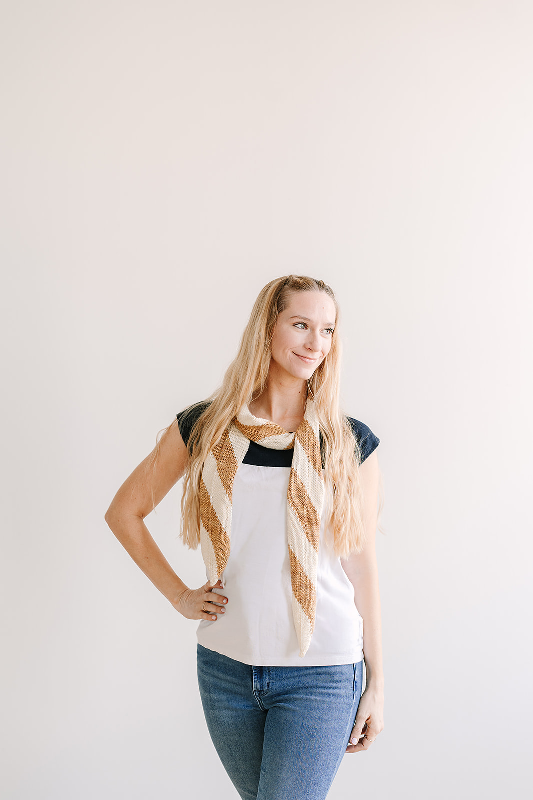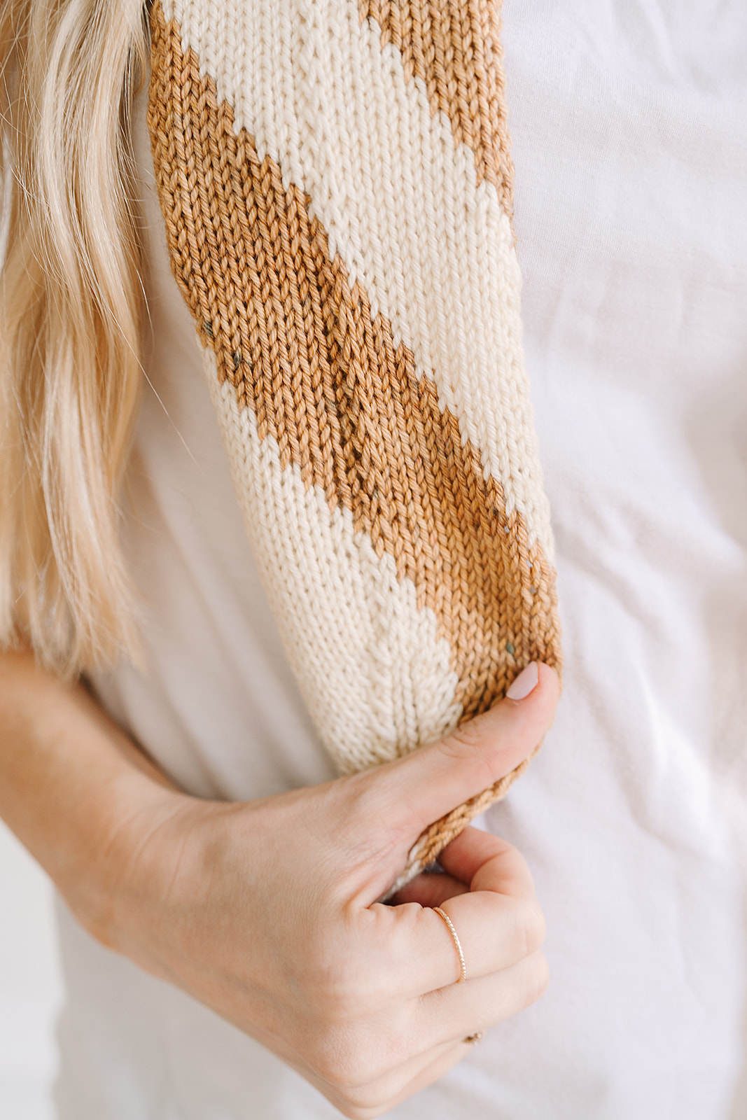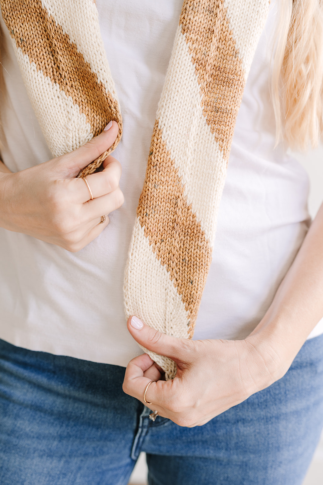 Welcome transitional weather with the Cabana Stripe Skinny Scarf. This multi-season piece combines the skinny-scarf trend with bold diagonal stripes. The design was inspired by beach-cabana fabrics, adding a touch of summer at any time! Worked end-to-end in basic intarsia with slip stitch edges, it can be left with rolled edges or blocked out for more width.
