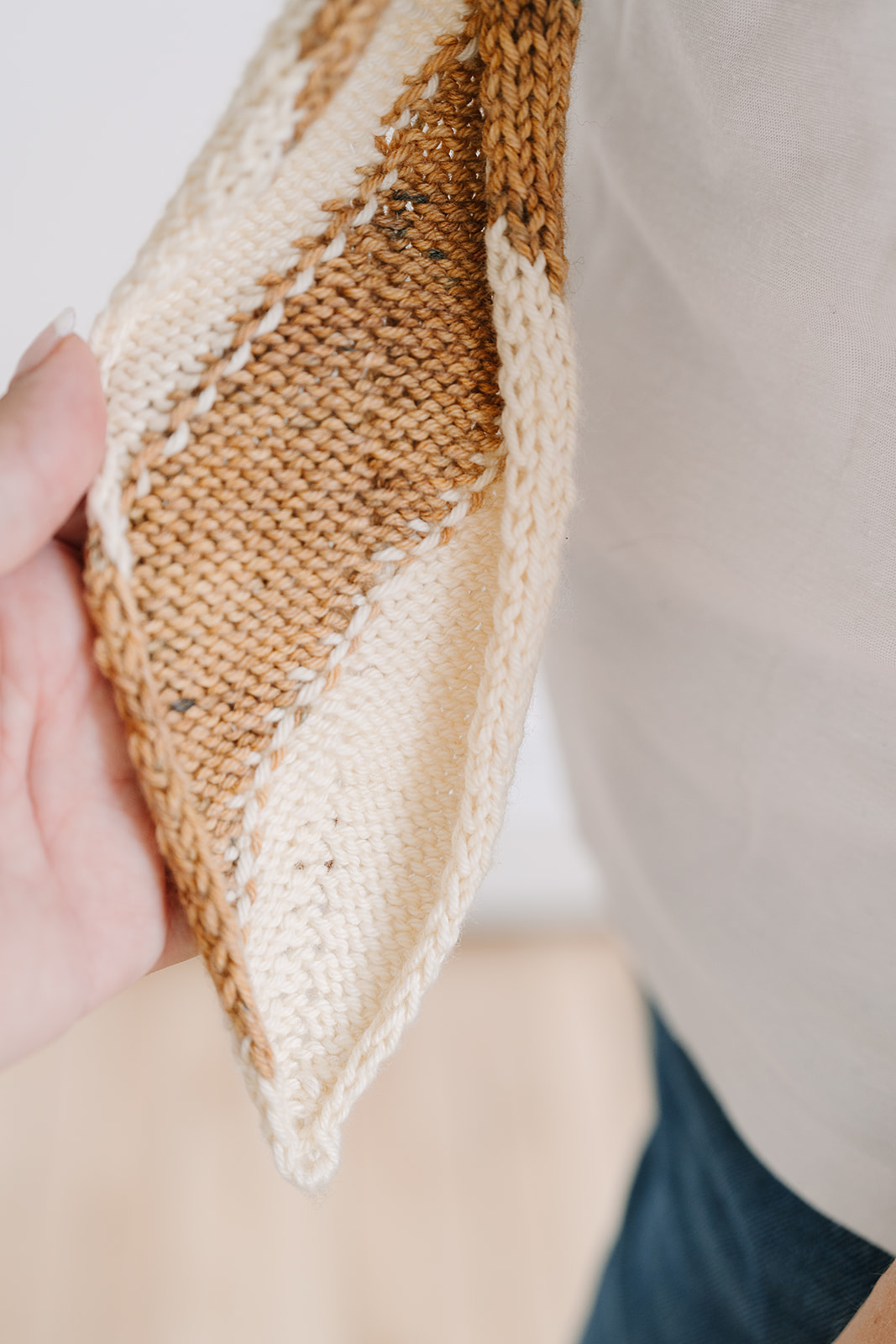 Yarn: Olive and Two Ewe “Tolkien DK” (50% superwash merino, 50% cotton; 231 yards [210 meters] / 3.5 ounces [100 grams]): Vanilla Cloud (MC 1 skein), Spun Gold (CC 1 skein)