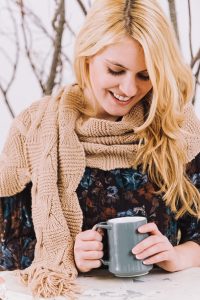 Notions: Tapestry needle; (optional) removable markers; cable needle; crochet hook (to attach fringe)