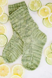 Rnd 2: K to 3 sts before instep, k2tog, k1, work instep in pattern as establish, k1, ssk, k to end of rnd – 2 sts dec’d.