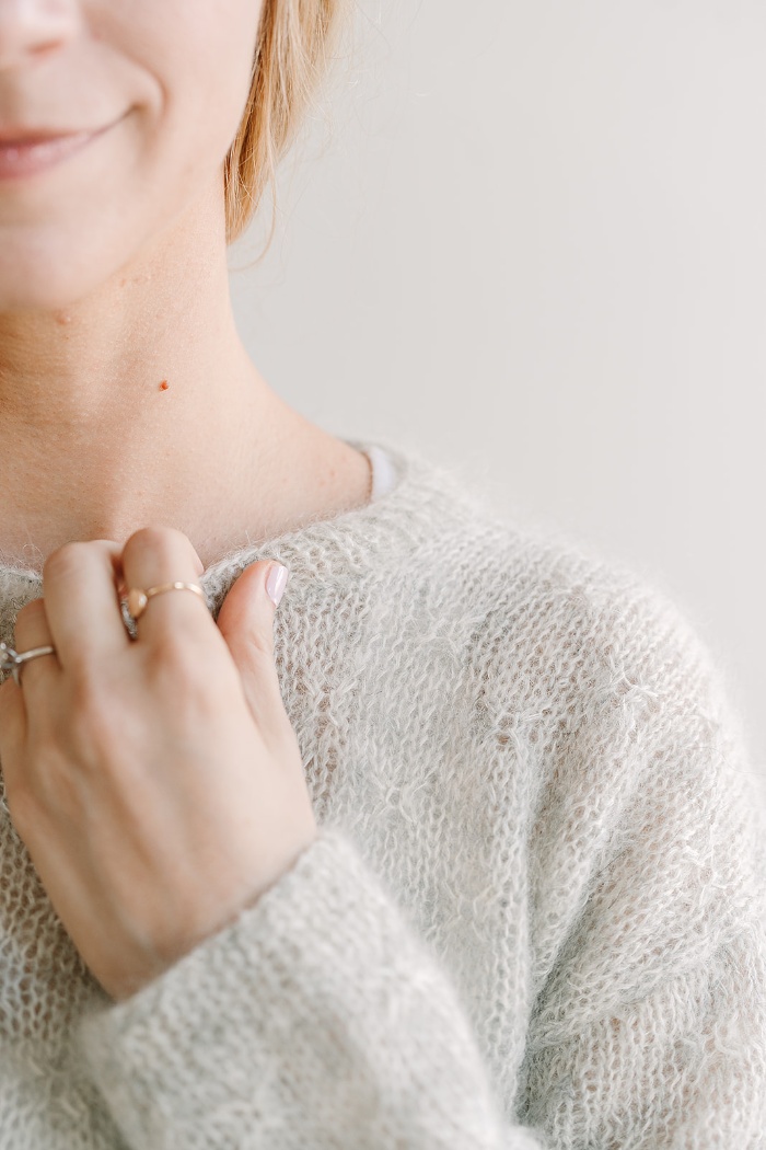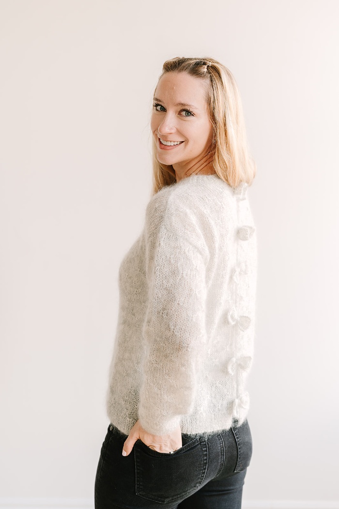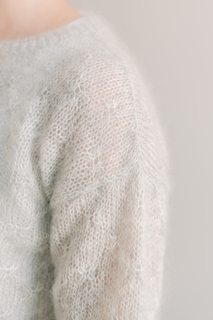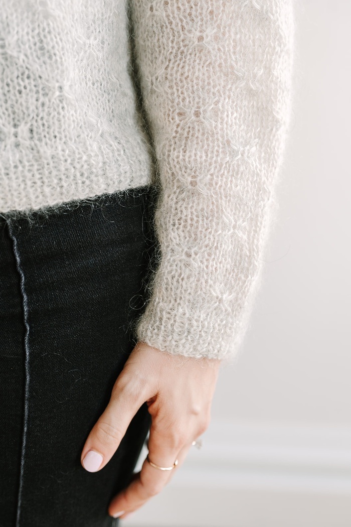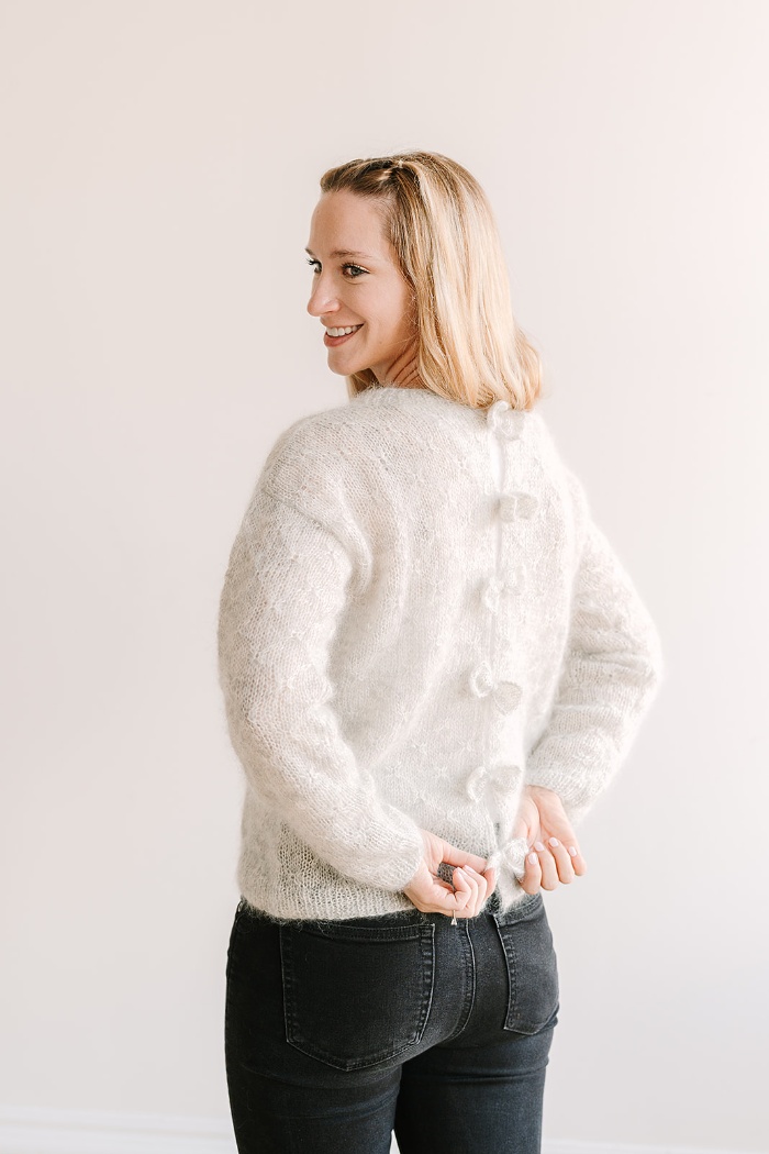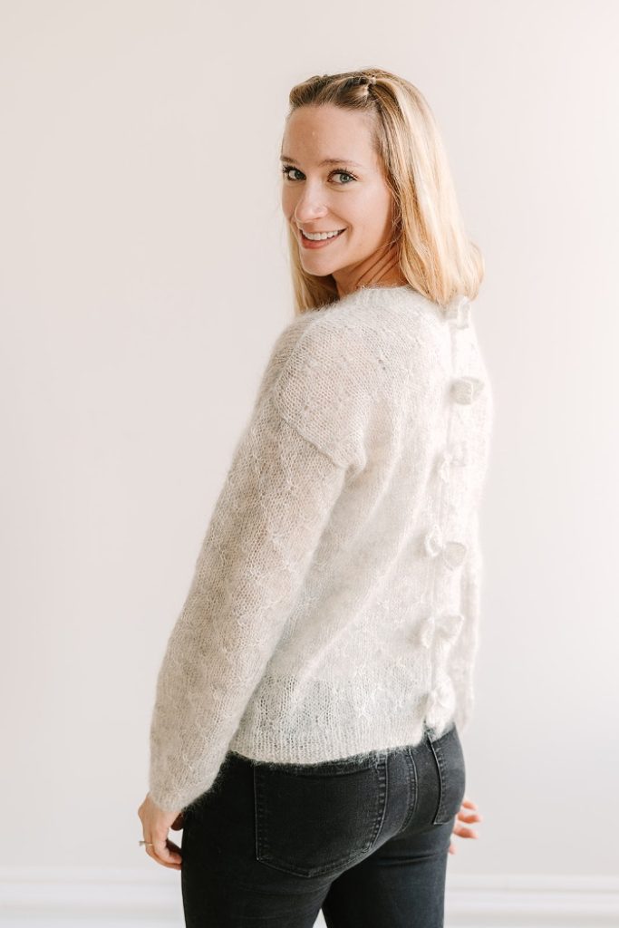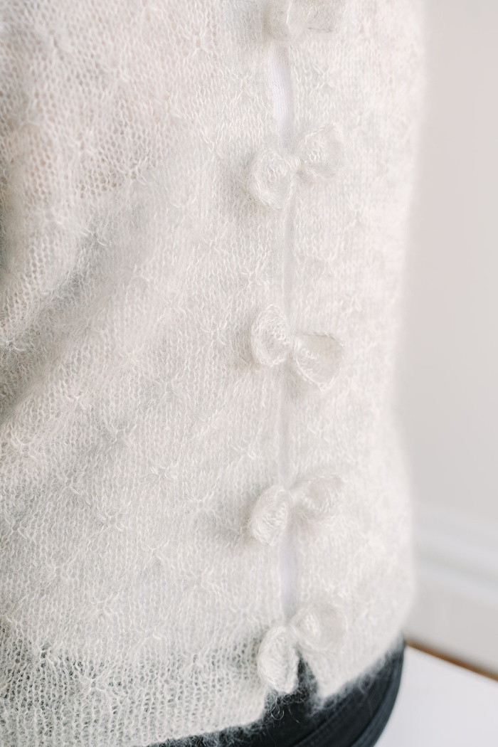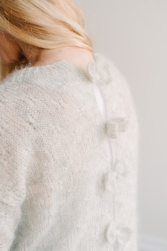 Embrace the beauty of laceweight yarn with the Gossamer Bowback Sweater, an elegant, showstopping piece perfect for all winter long. Light as air yet surprisingly warm, its subtle texture and silvery, neutral hue make this a sweater that pairs well with skirts, dresses or your favorite dark wash jeans. A semi-open back is drawn together with delicate knitted bows to keep the sweater charmingly semi closed.