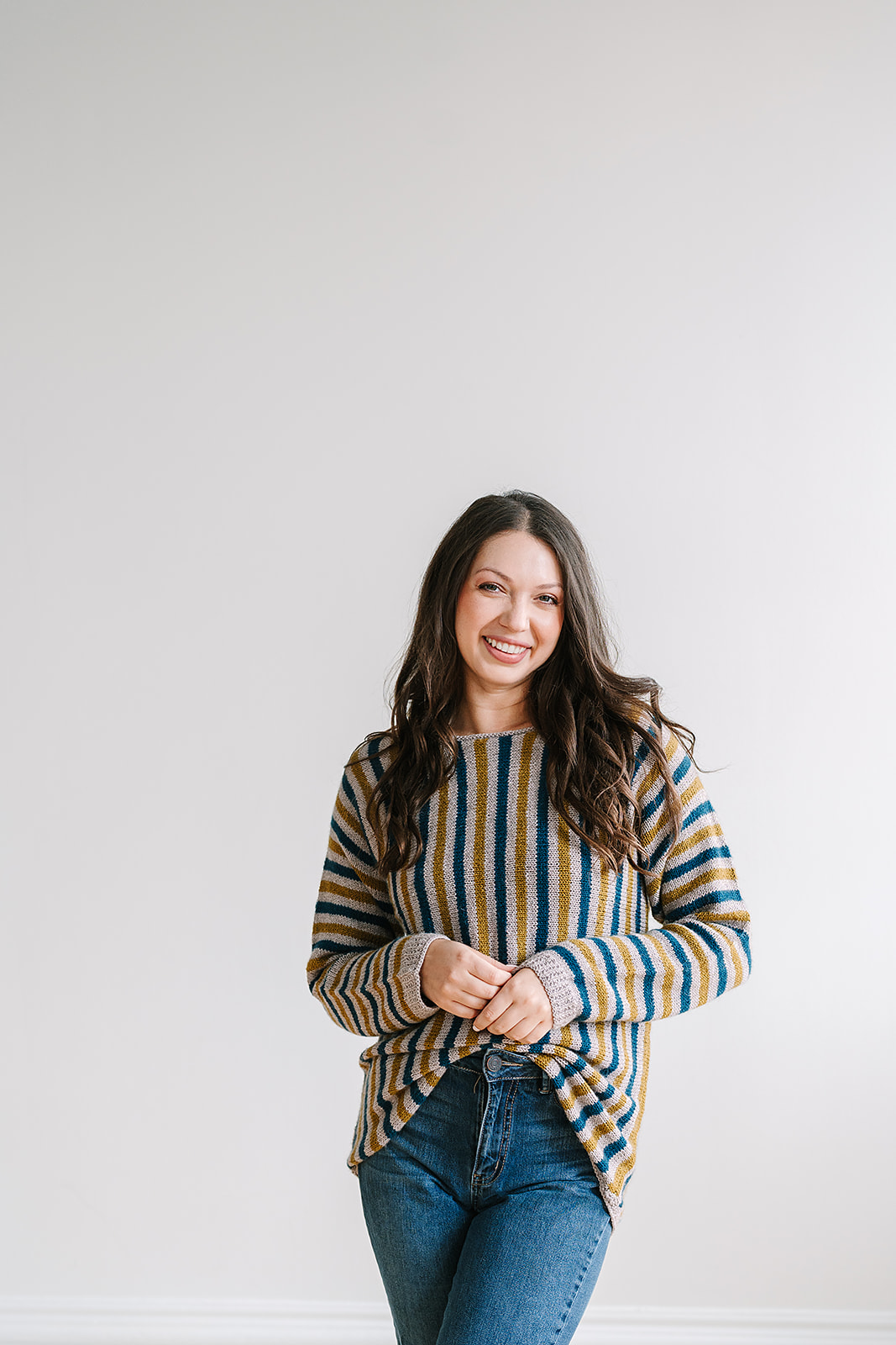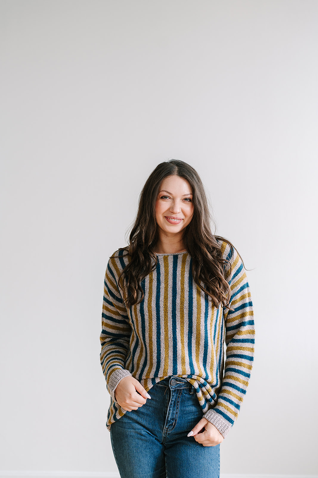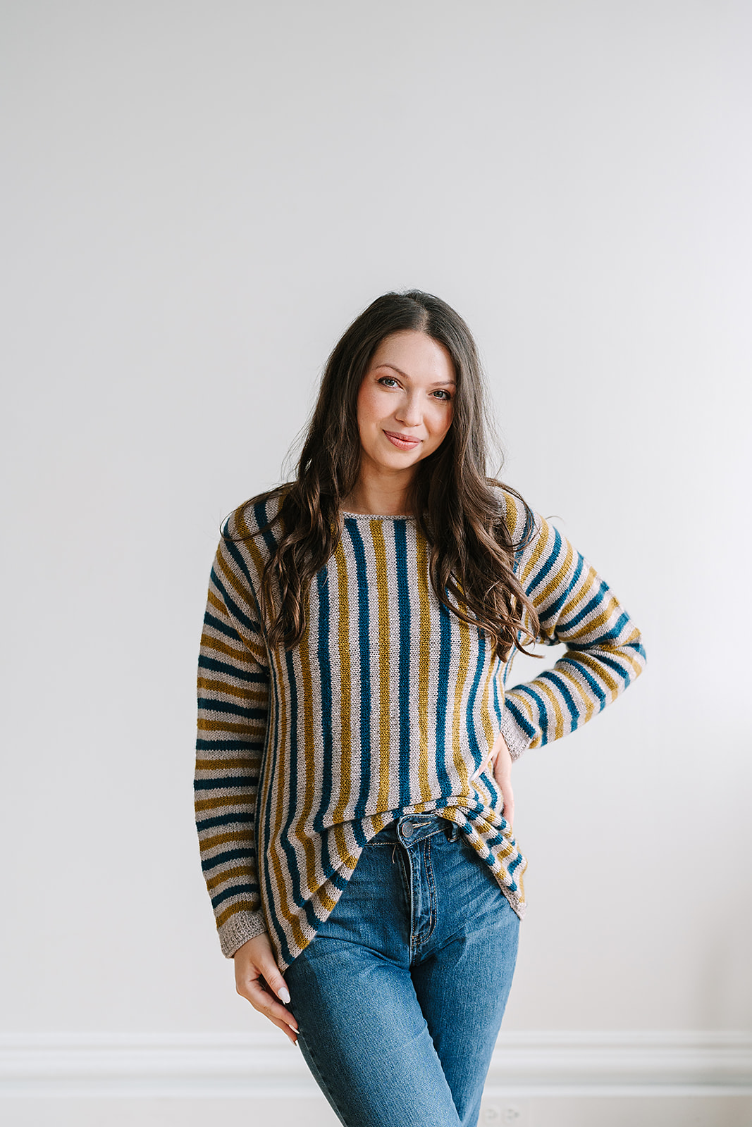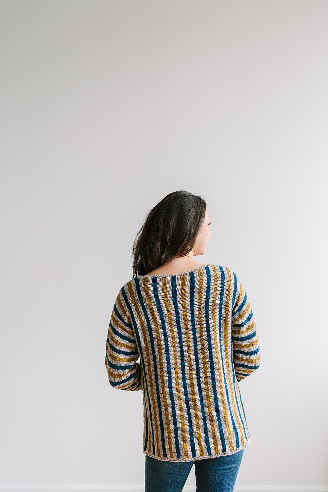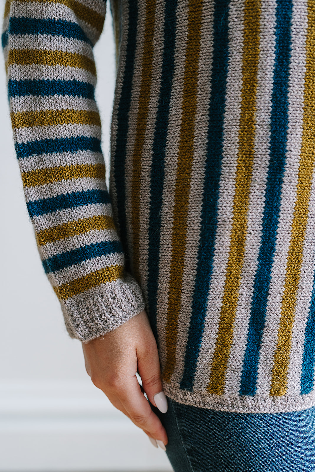 Cozy up with the Hambrooks Pullover, an everyday sweater with an intriguing and addictive construction. This sweater is worked flat from one sleeve cuff to the other, with front and back worked at the same time across the body. Working the stripes sideways in this way creates a striking vertical pattern! The interesting construction keeps this project fun to knit and the stripe pattern is easy to memorize.