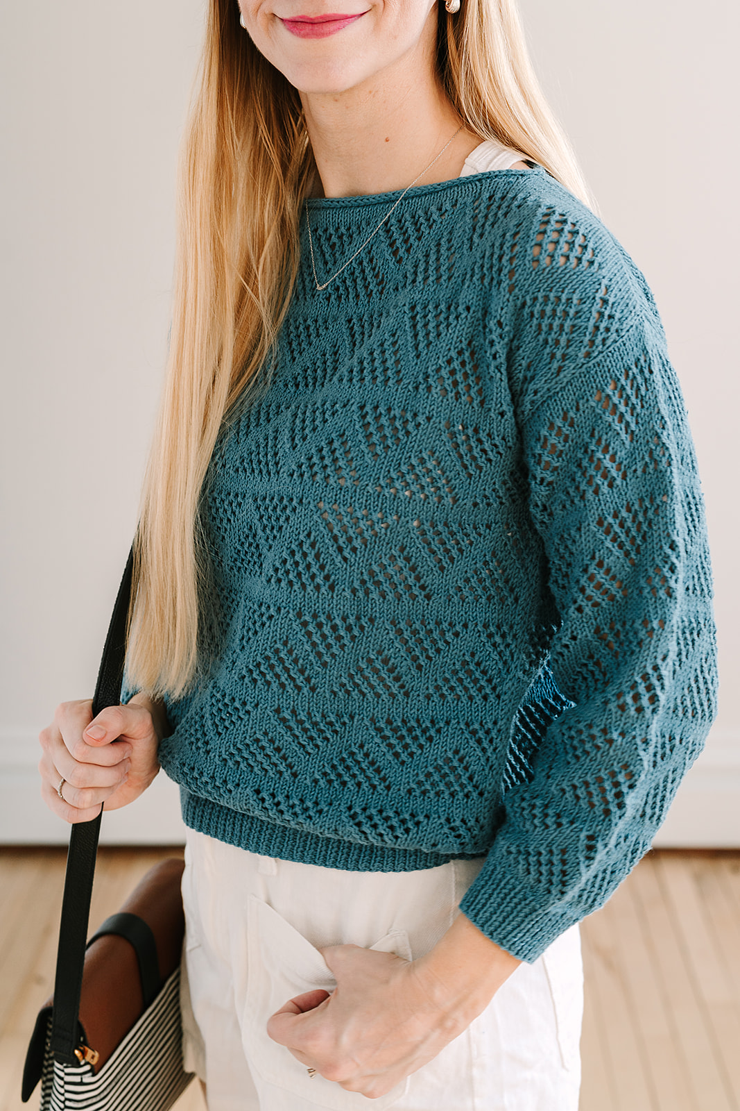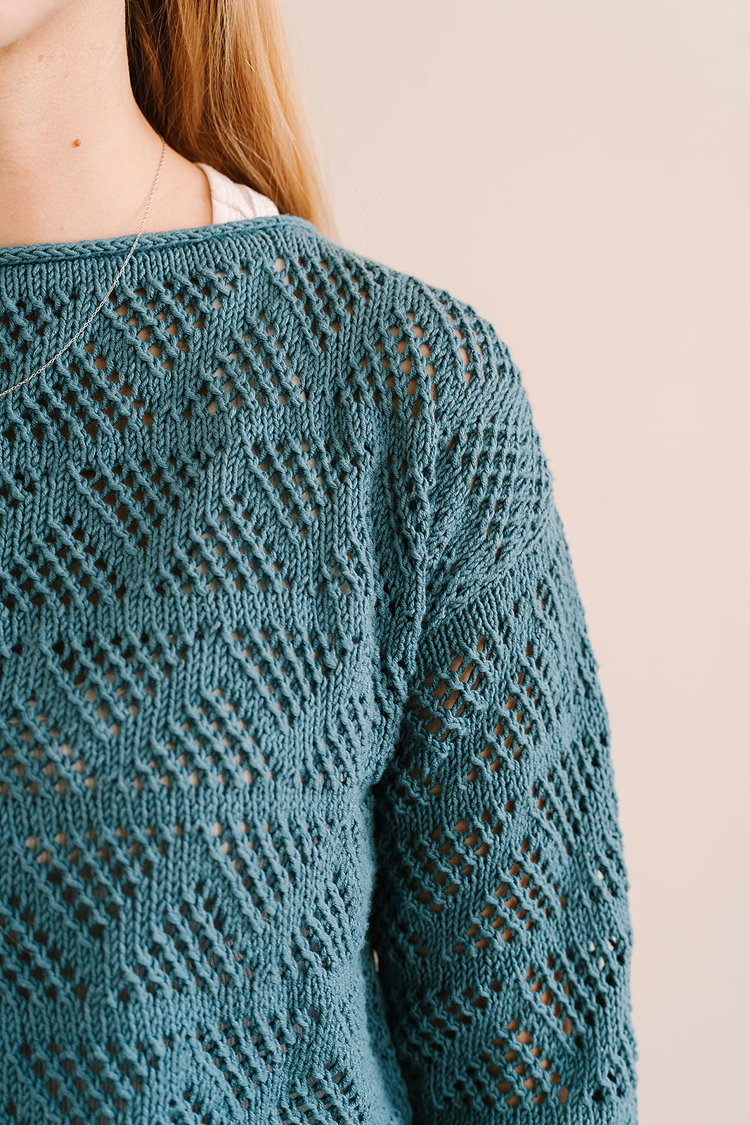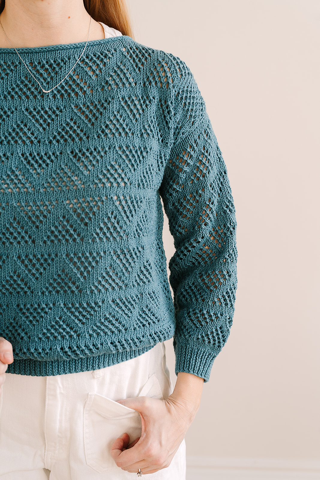 A timeless sweater with a graceful boat neck and relaxed drop sleeves, perfect for year-round wear. Knit in pieces from the bottom up and seamed for structure, it features a soft cotton blend yarn and an eye-catching zigzag lace pattern that adds just the right touch of texture and style.