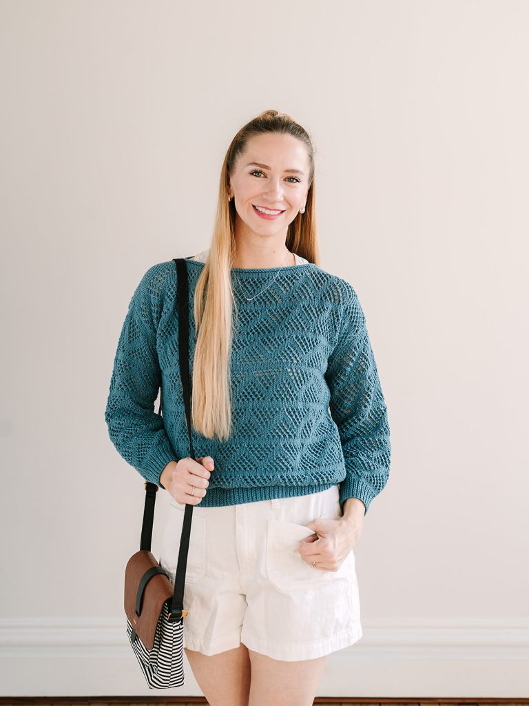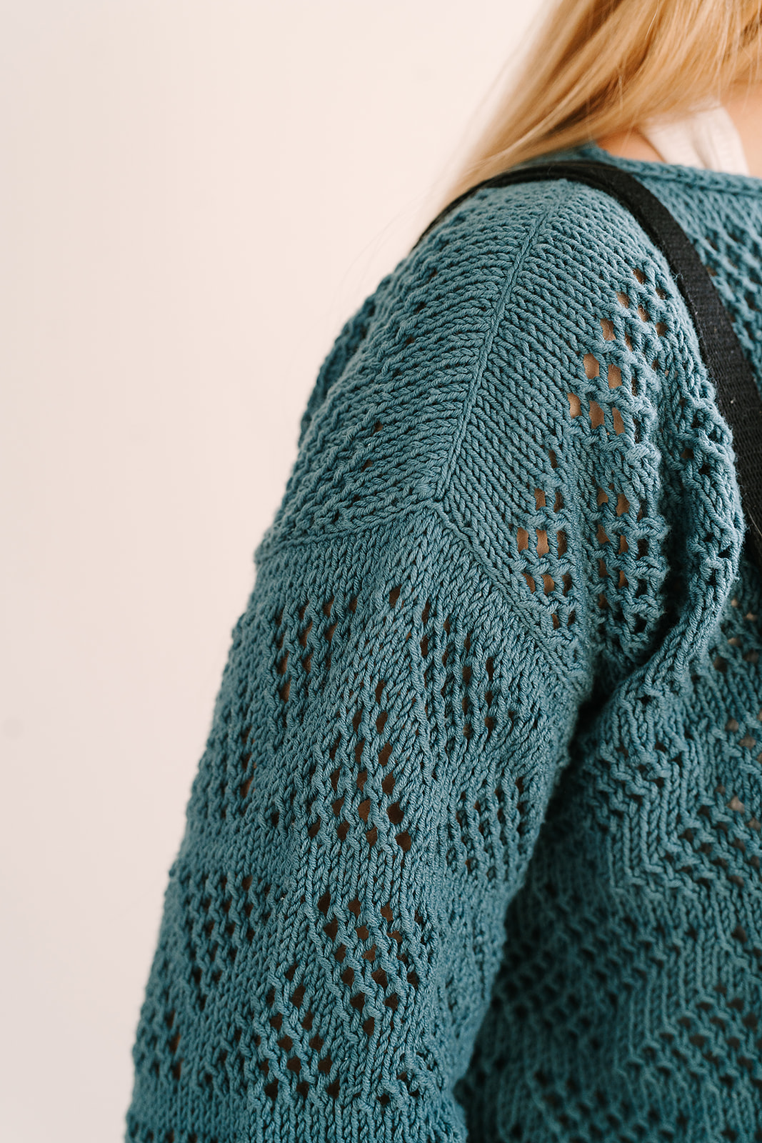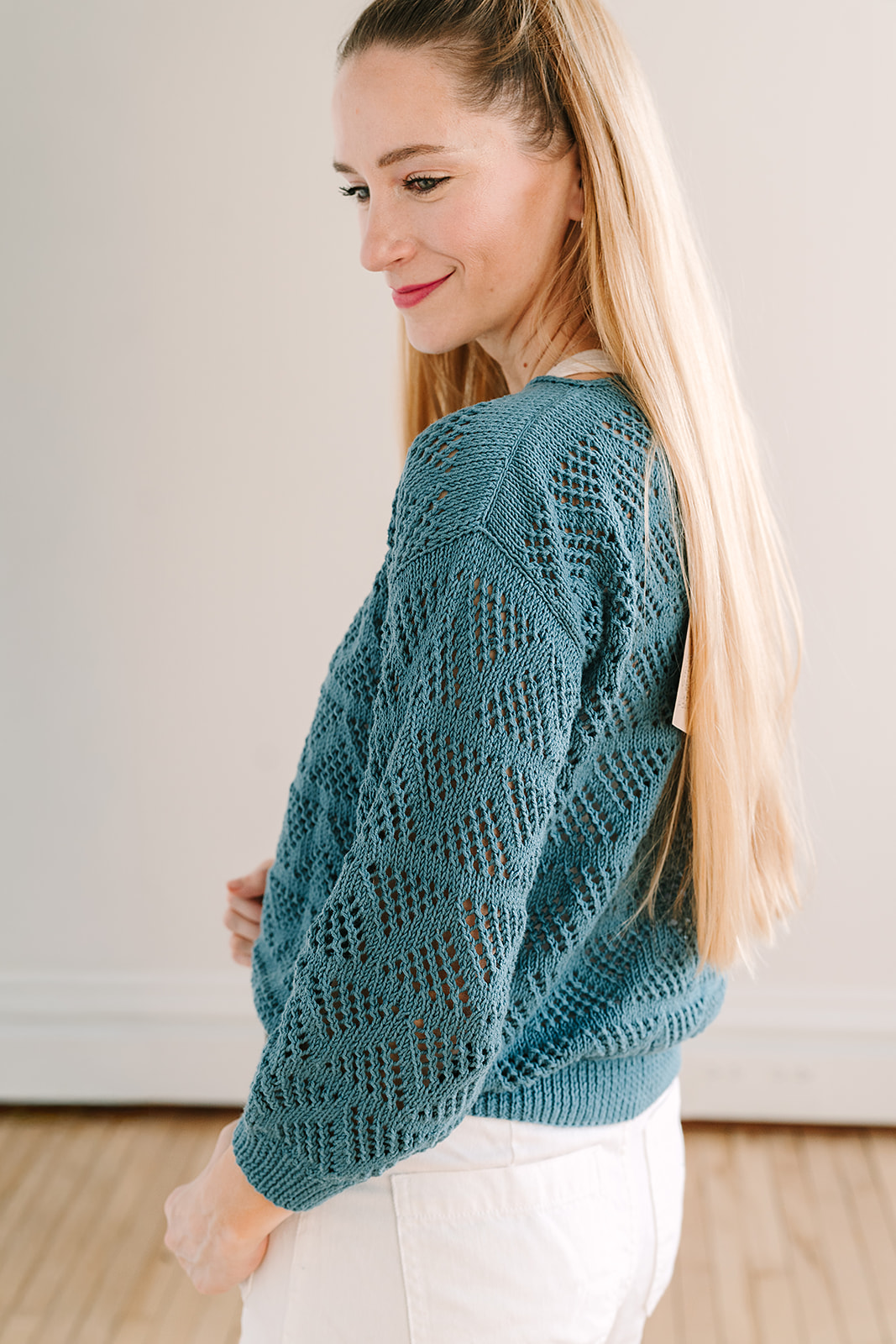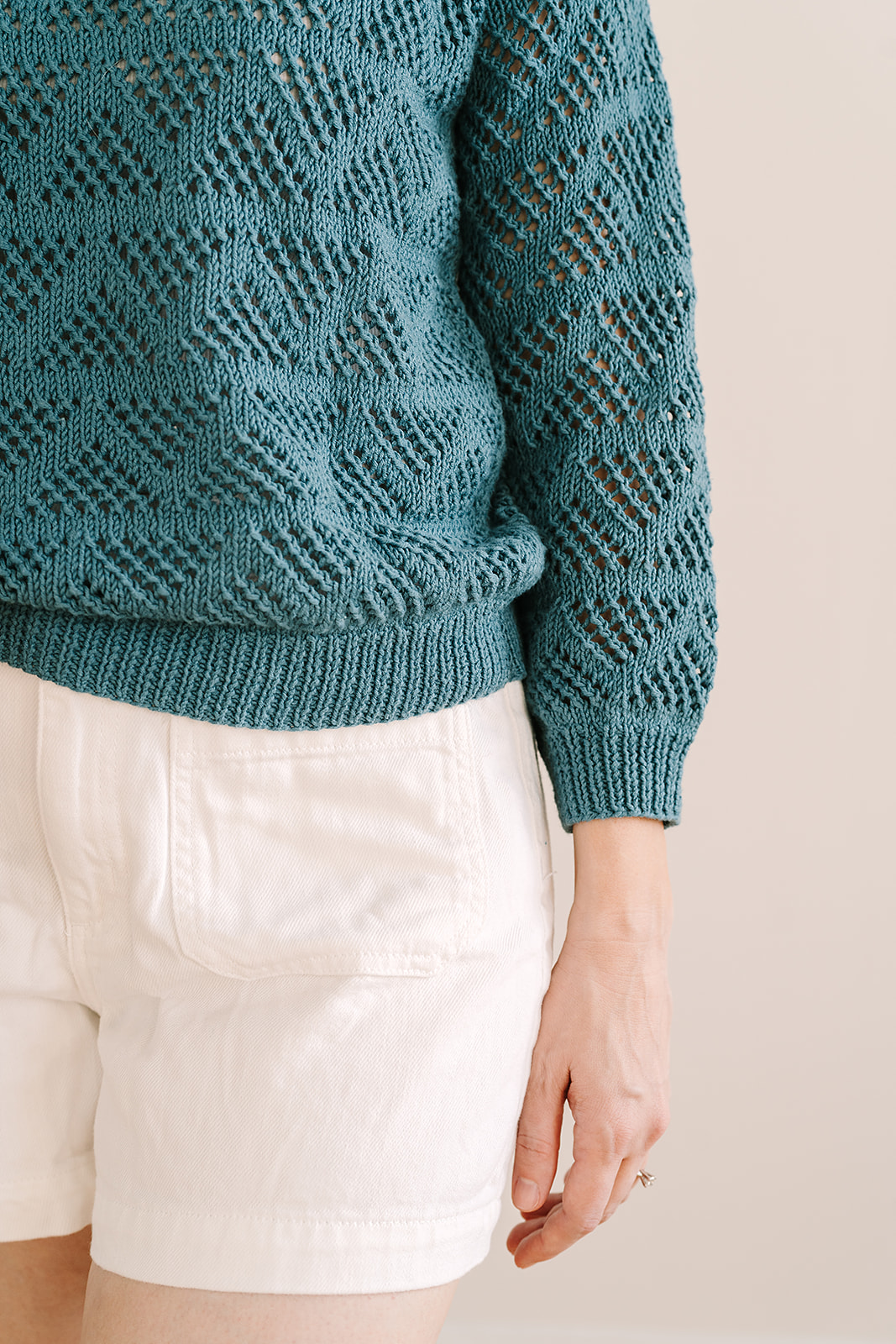 A timeless sweater with a graceful boat neck and relaxed drop sleeves, perfect for year-round wear. Knit in pieces from the bottom up and seamed for structure, it features a soft cotton blend yarn and an eye-catching zigzag lace pattern that adds just the right touch of texture and style.