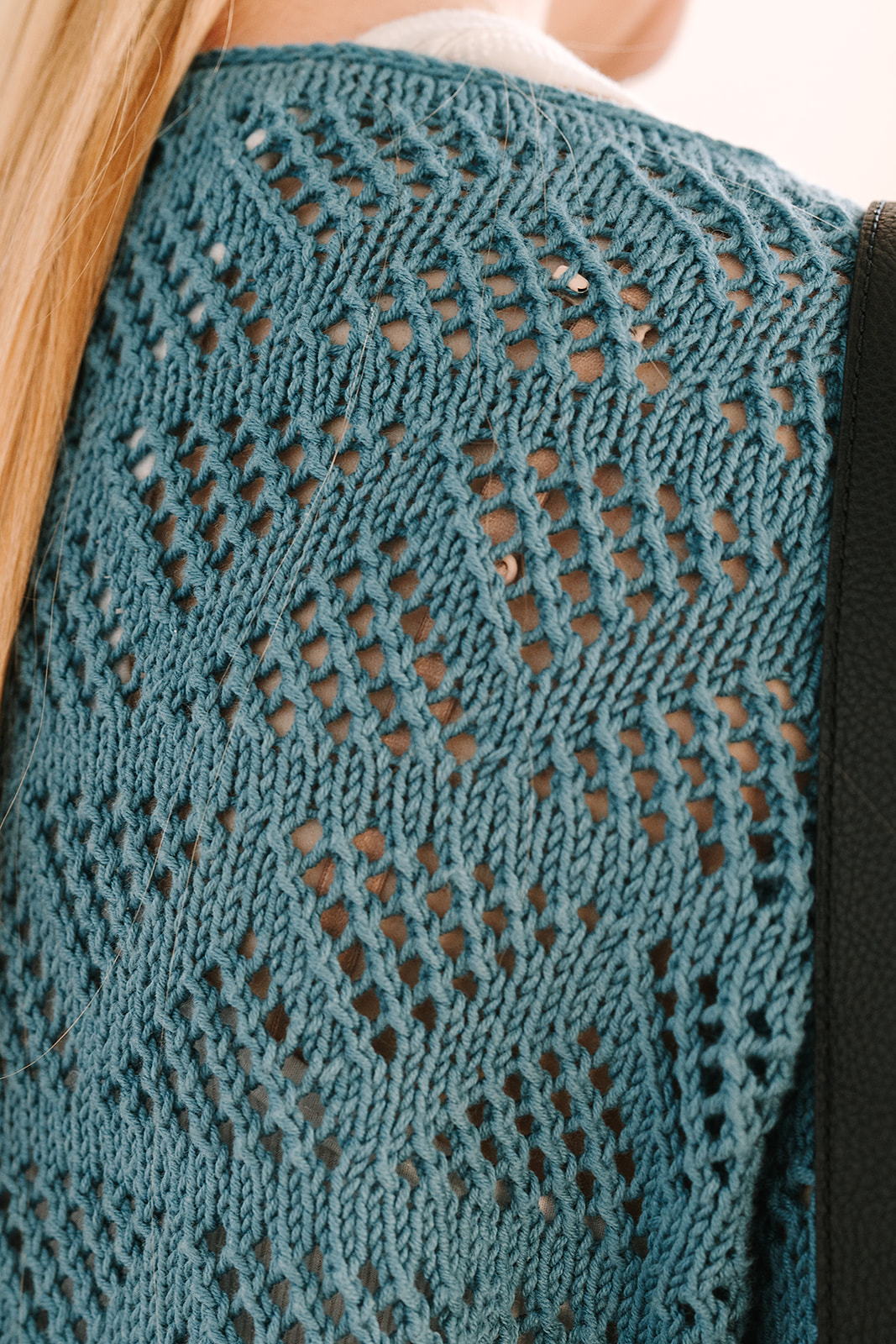 Row 15: K1, yo, *ssk, [yo, ssk] 2 times, k3, [yo, ssk] 2 times, yo; rep from * until last 3 sts, ssk, k1.
