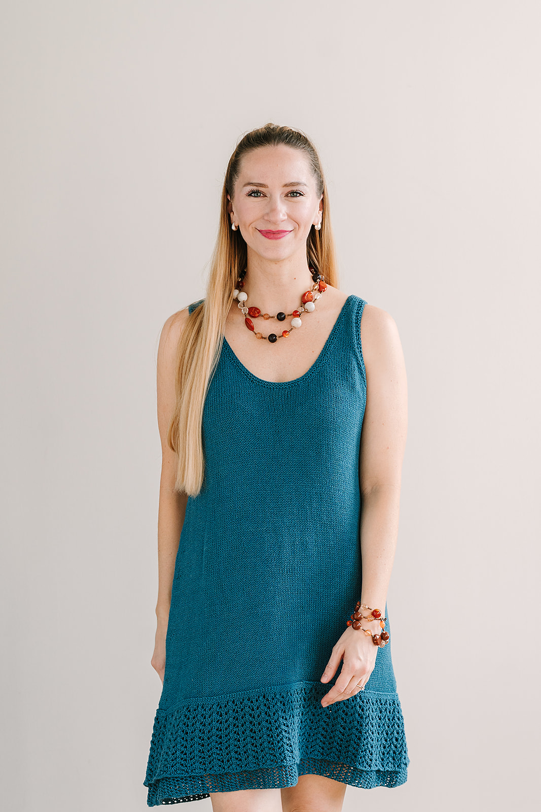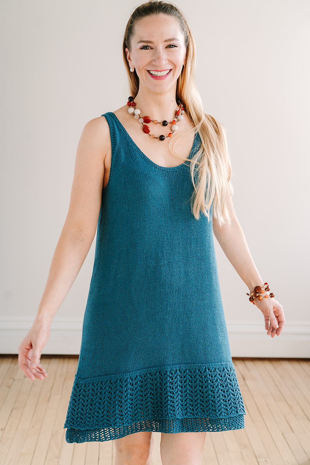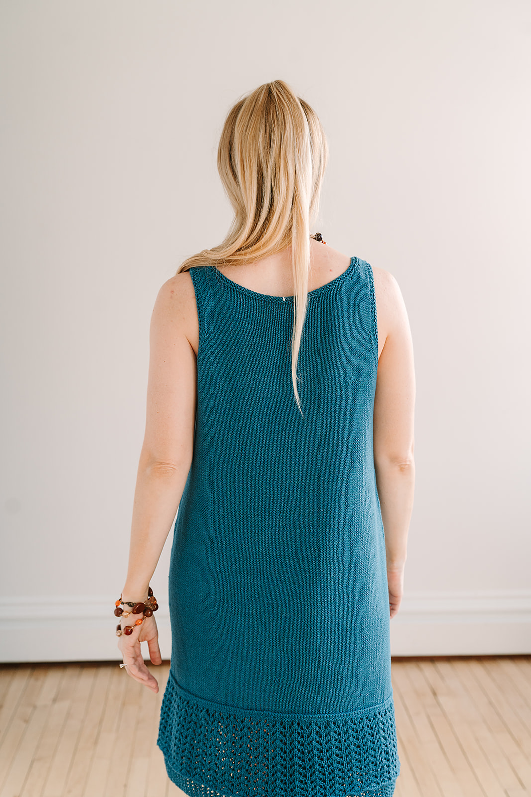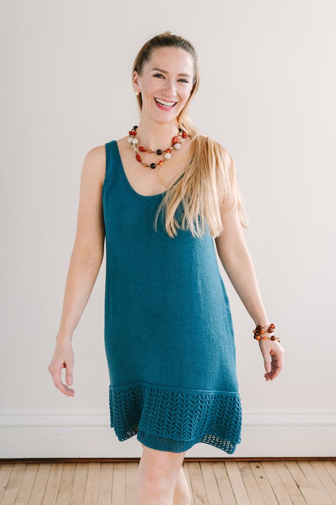 Dress is worked top down, joined at the underarms and worked in the round to the bottom. Lace hem is worked in the round from the bottom up and joined to the dress with three-needle bind off.