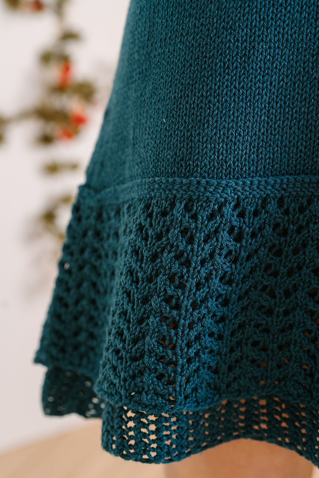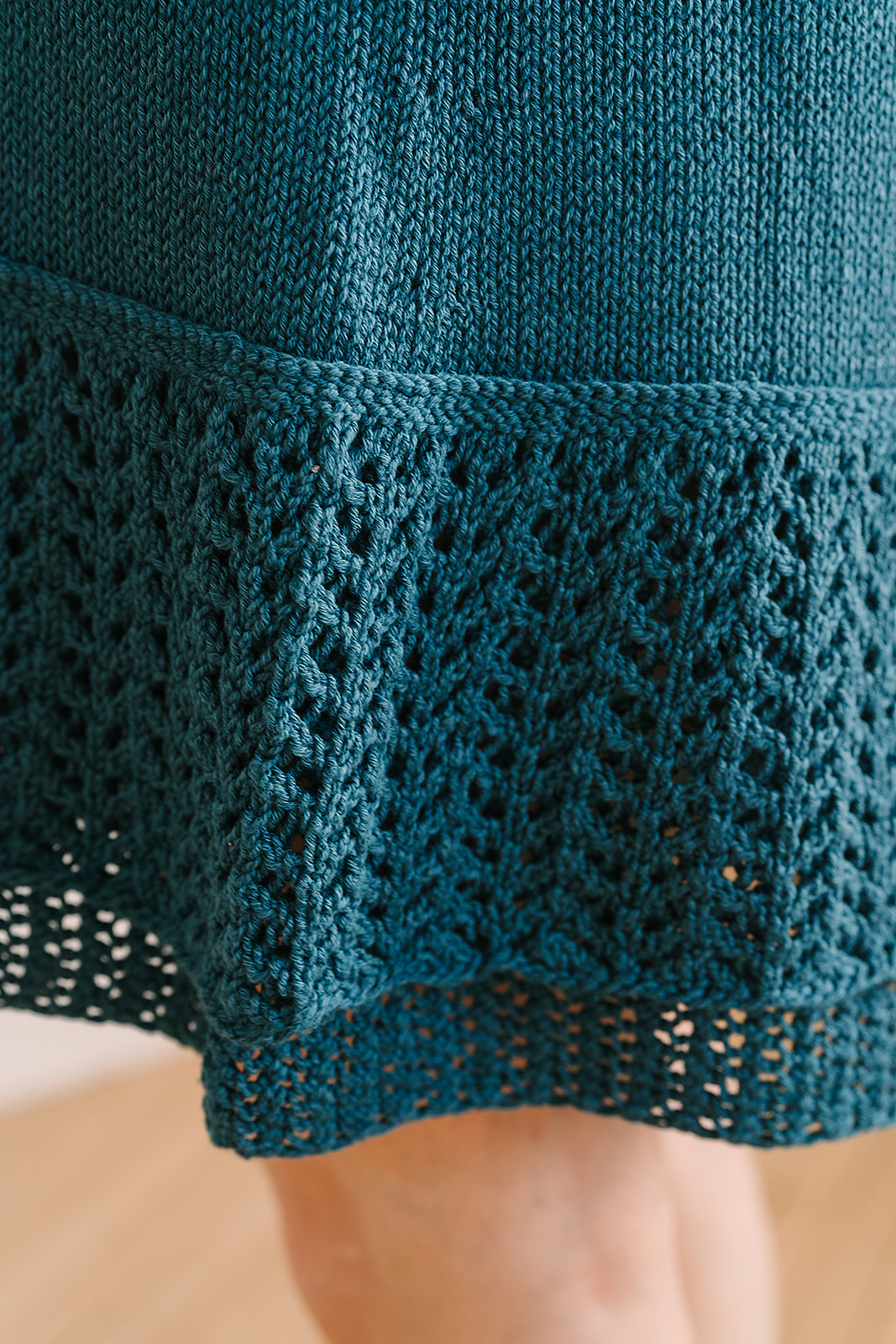 The ruffled hem consists of two layers; the under layer worked in reversible mesh and the top layer worked in lace. Each layer is worked one at a time, in the round from the bottom up, then both are joined together with three-needle bind off.