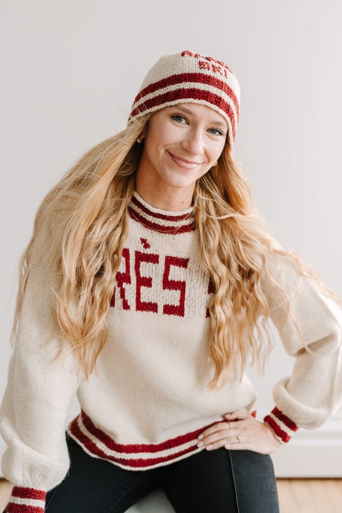 The Après Ski Set is the perfect ensemble to wear after a day on the slopes, offering both warmth and style. This matching hat and sweater feature the words “Après Ski” in playful colorwork, achieved with intarsia on the sweater and embroidery on the hat. Vintage-inspired ribbing adds classic charm, while the whimsical details make this set a comforting, stylish choice, perfect for an après-ski cozying up.