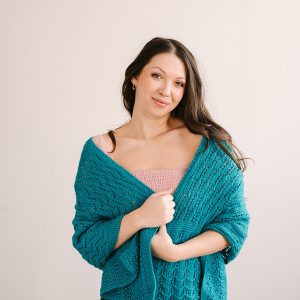 This stunning teal wrap features six beautiful stitch patterns, making it a perfect project for exploring and practicing lace techniques. Follow the full sequence for a richly textured piece, or mix and match one or two patterns to create a wrap that’s uniquely yours.